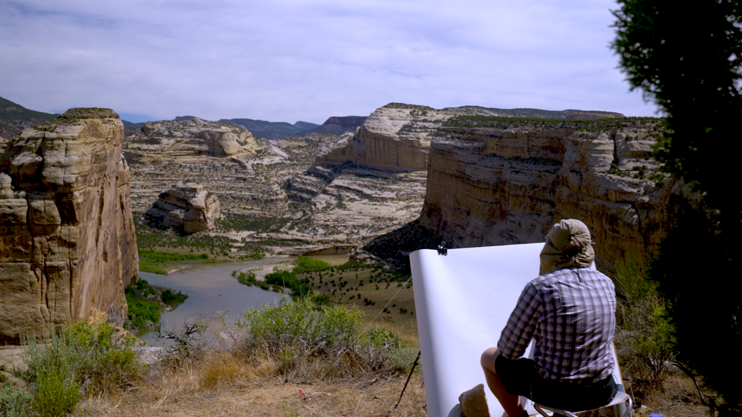 Tony Foster painting Steamboat Rock at Echo Park, Colorado, on the Green River. June 29, 2019.